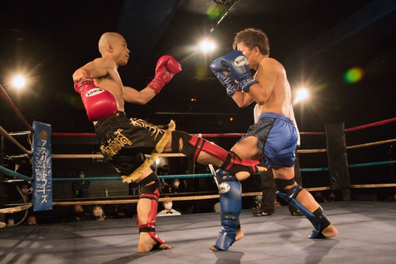 1R 長友(左)の右ローキックが幸島(右)の右脚にヒット
