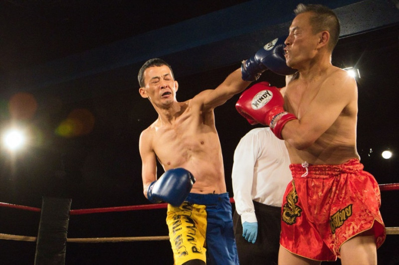 1R 田中(左)の左ストレートがしんのすけ(右)にヒット