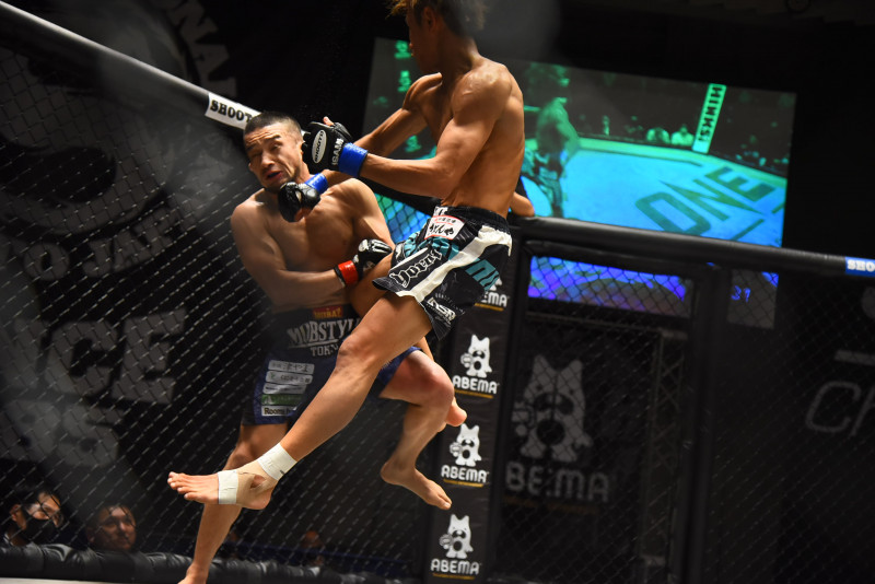 清水清隆(左)に右フックを当てる平良達郎(右)