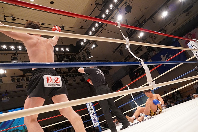 松岡のヒザ蹴りがヒットし、ダウンかと思われたが、反則裁定