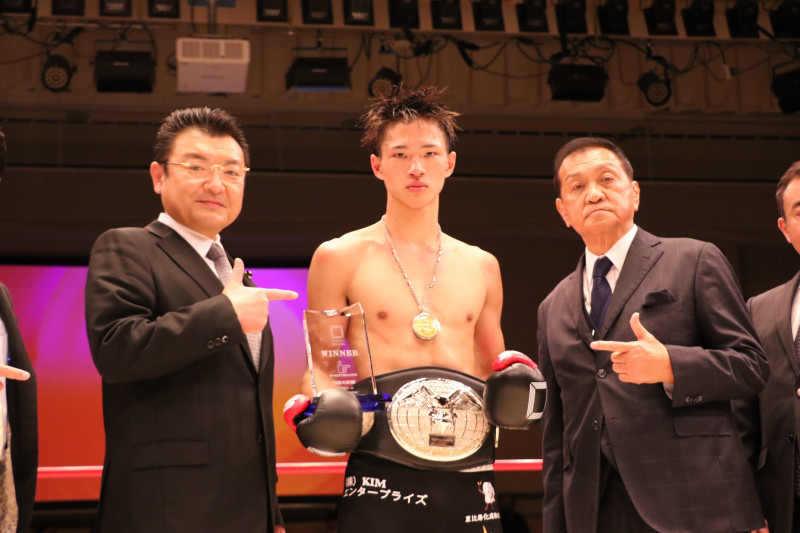 悲願のチャンピオンベルトを腰に巻いた笠原