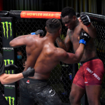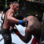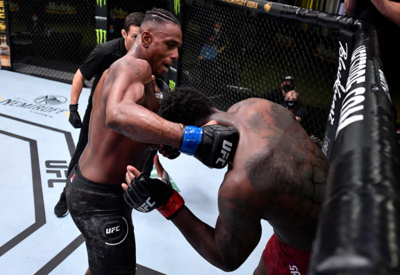強烈なパンチを打ち込むヒル(左・getty/Zuffa LLC/UFC)