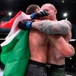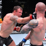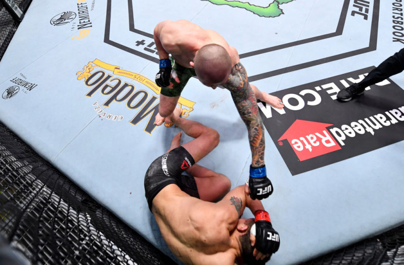 ヴェットーリはハーマンソンをケージに詰め左ストレートでダウンを奪った(左・getty/Zuffa LLC/UFC)