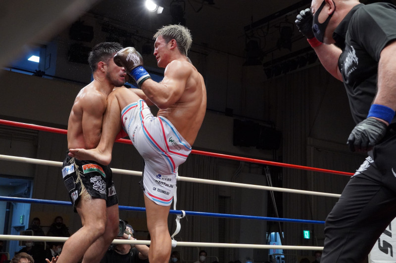 松倉の狙いすました左ヒザ蹴りが炸裂