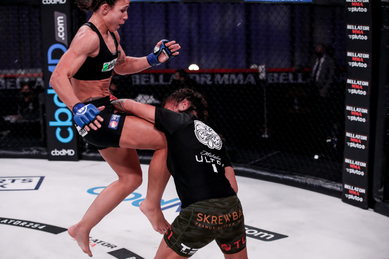 飛びヒザをヒットさせるベラスケス(左)