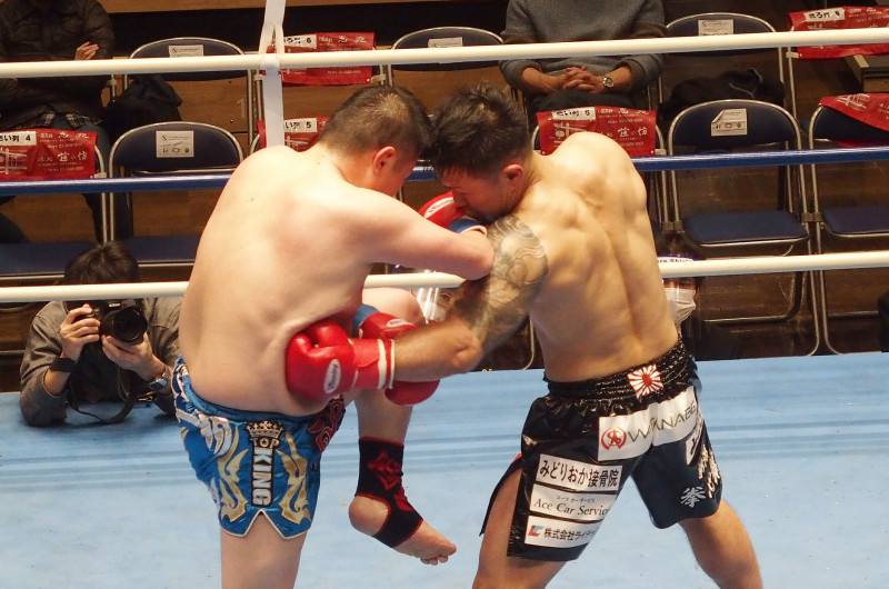 大畠の大きなお腹に何度も田村のボディブローでレバーをえぐった