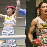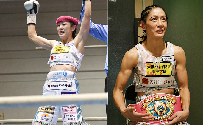 勝利の瞬間の奥田(左)と試合後、控え室で世界王座のベルトを手にする奥田(右)