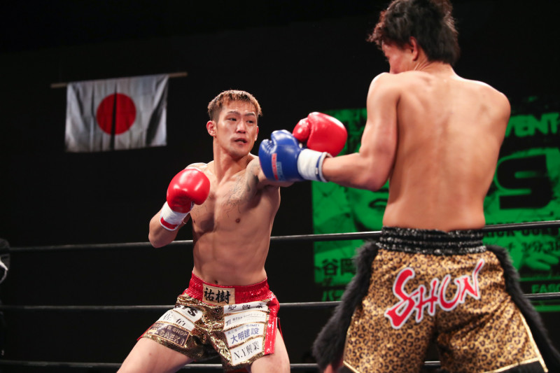 -60kg王者王者・谷岡(左)が1R TKOで初防衛に成功、その場でベルト返上とMMA転向を表明した