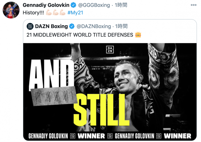 ゴロフキンがツイッターで21度目の防衛に喜ぶ