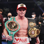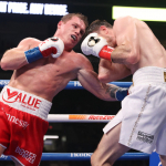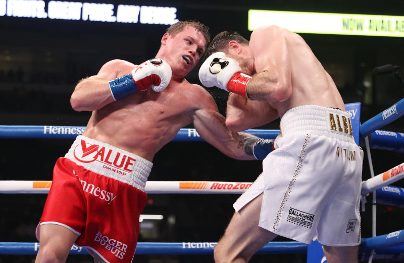 カネロが18センチも身長が高いスミスにボディブローを叩き込む(C)DAZN
