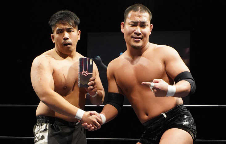 デスマッチファイター(左)と僧侶の異色タッグが勝利©ハードヒット実行委員会