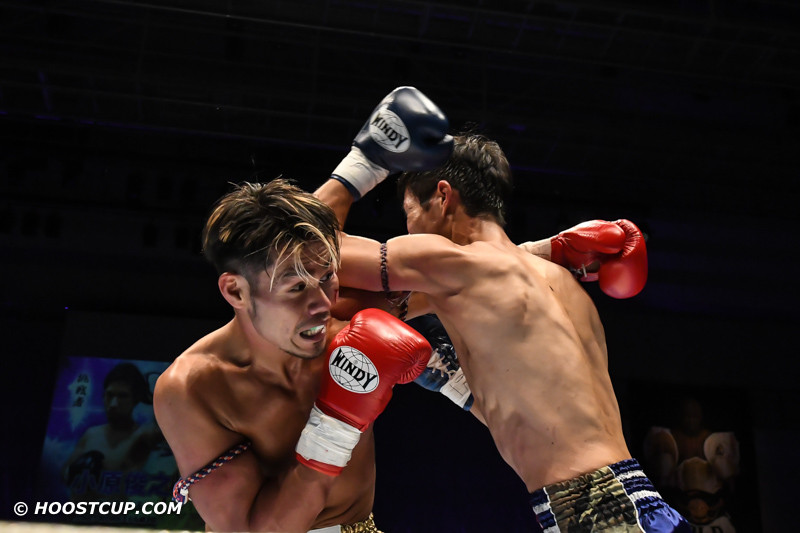 ヒジを狙う小原(右)