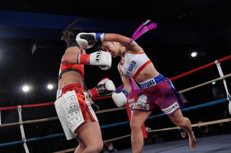 大きく左フックを振り回す宮﨑小雪(右)