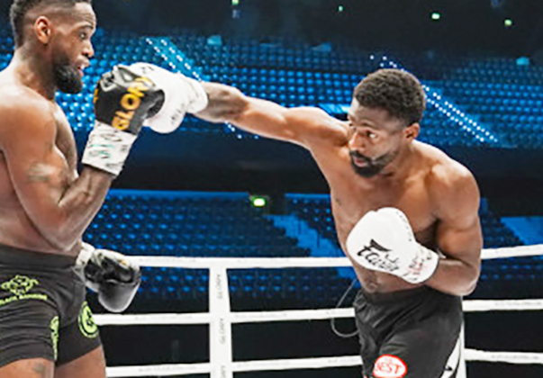 グローエンハート(左)に右ストレートを放つドゥンべ(右)©️GLORY