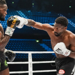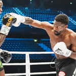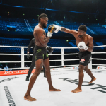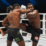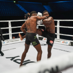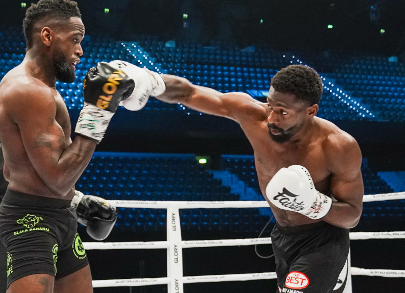 グローエンハート(左)に右ストレートを放つドゥンべ(右)©️GLORY