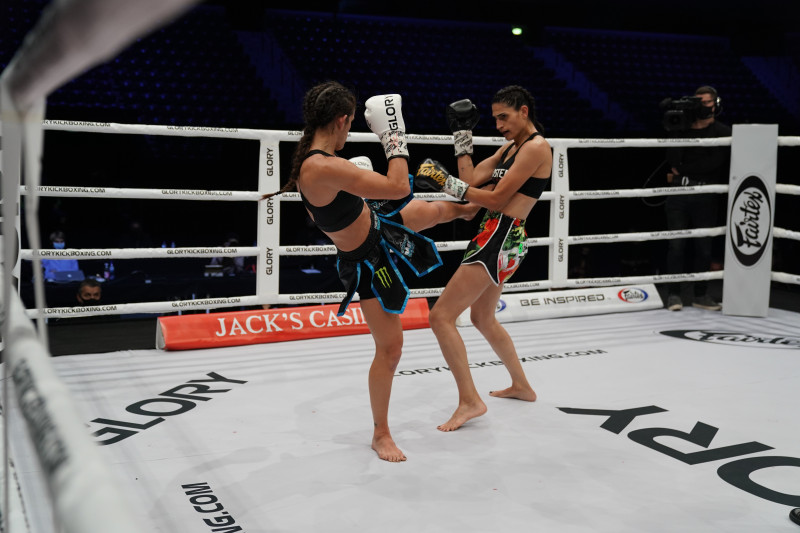 鋭い左ミドルキックを放つ王者のティファニー・ヴァン・ソエスト(左)©️GLORY