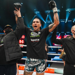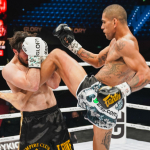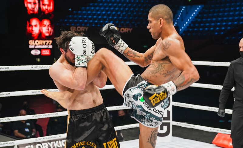 強烈なヒザ蹴りを放つペレイラ(右)©️GLORY