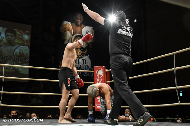 RYOTAROがカーフキックで剛王から2度のダウンを奪った