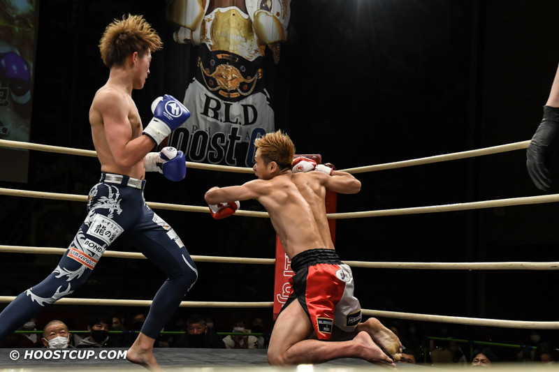 魁斗(左)は泰良にカーフキックでダウンを奪う