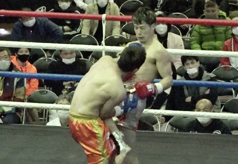 我謝のパンチの連打にひざ蹴りを入れる高橋