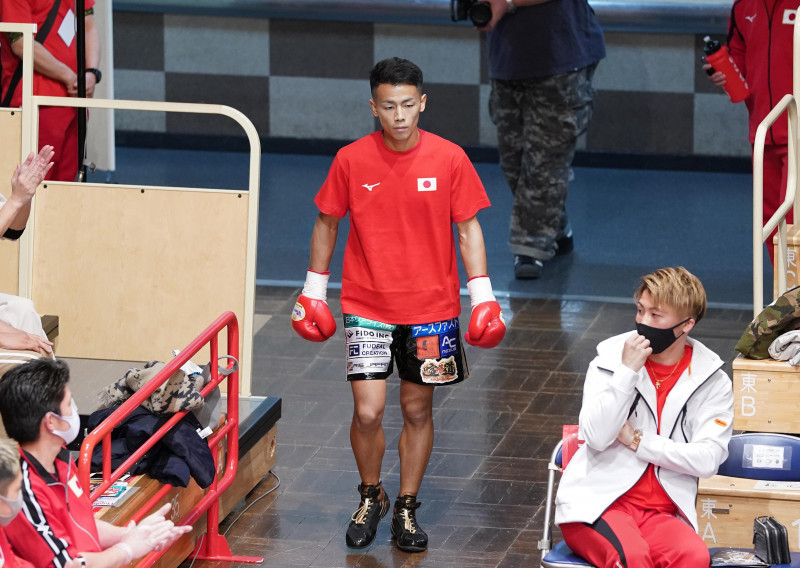 武居がプロデビュー戦に入場する。傍には井上尚弥がいる(NaokiFukuda)