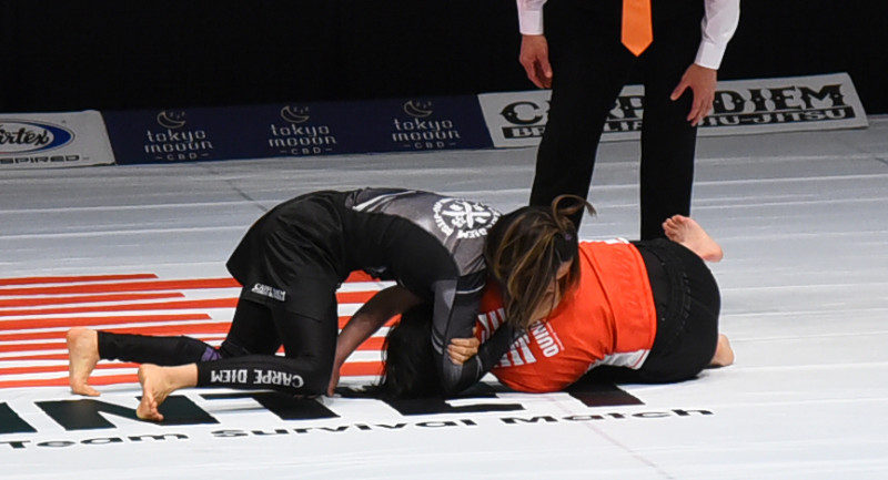 菅里実(左)が岸田蘭音(右)にダースチョークで一本勝ち