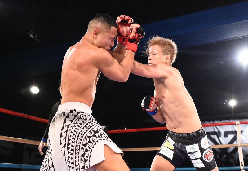 本田(右)がパンチで加藤を苦しめる(C)DEEP