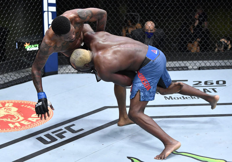 ブルソン(右)がホランド(左)からテイクダウン(©Getty Images/UFC)