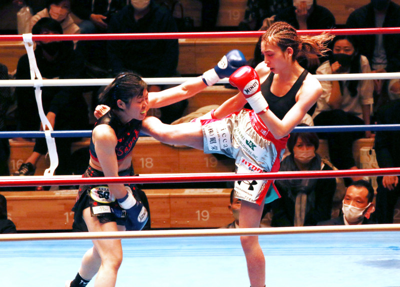 リーチある蹴りで攻めるアリス(右)だったが、突貫ファイターの武内(左)に判定で敗れた