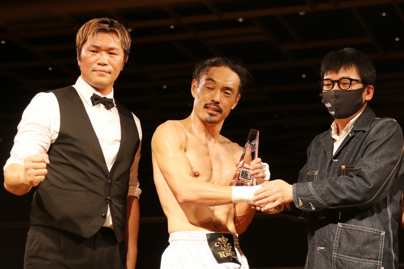 KO勝利した安彦と握手するRIZINの笹原広報。左は主催の小比類巻貴之