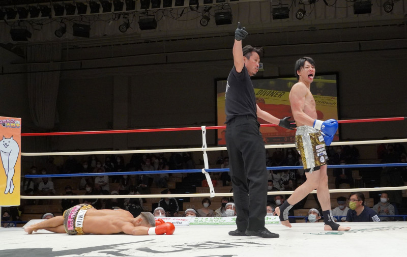 幸輝(右)の右ストレートに、バッタリと倒れるFUMIYA