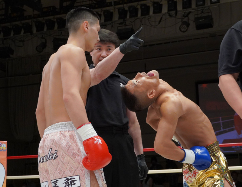 試合前にはお馴染みの堀井流メンチ切り「フラッシュバック」が飛び出した