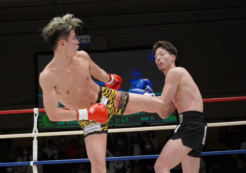 加藤がミドルキックで攻める