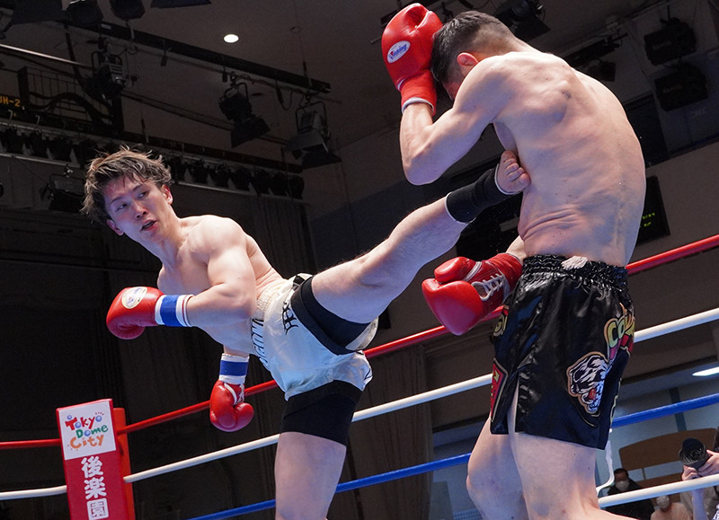 渡部翔太(左)がバックスピンキックを繰り出す