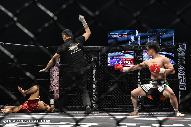 3度ダウンを奪い、空手の残心のようなポーズを決める斎藤(右)