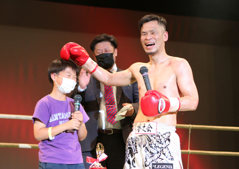 100戦目でTKO勝ち、長男(左)をリングに上げて笑顔の国崇