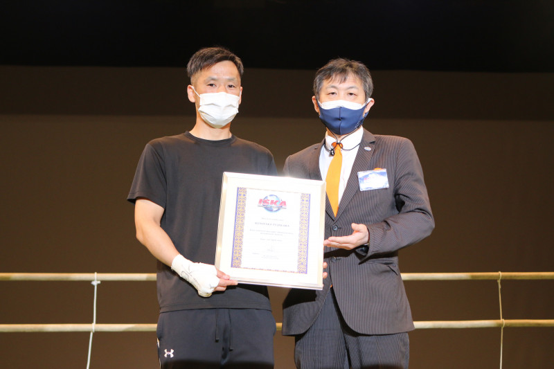 ISKAから100戦目を祝福する表彰を受けた国崇(左)