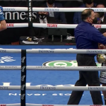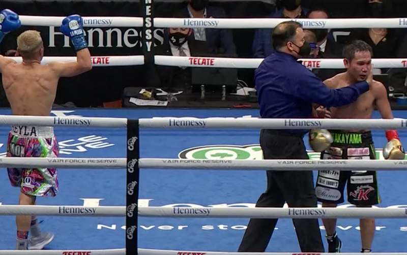 相手の連打に、グラついてもおらず突然レフェリーストップとなった高山(C)DAZN