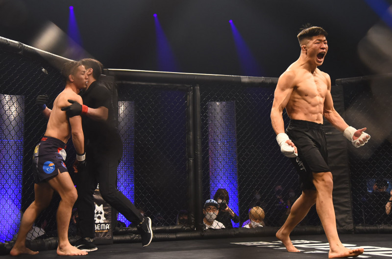新井(左)からTKO勝利し、雄叫びを上げる中村(右)