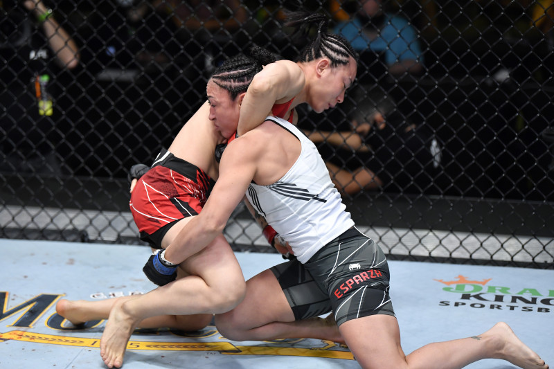 ダブルレッグでテイクダウンを奪いに行くエスパルザ(右)(©Getty Images/UFC)