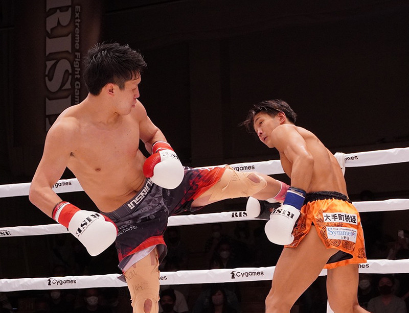 パンチからの左ミドルで攻撃を組み立てた稲石(左)