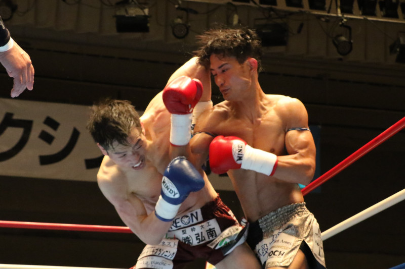 至近距離で振り下ろされる重森の右ヒジ