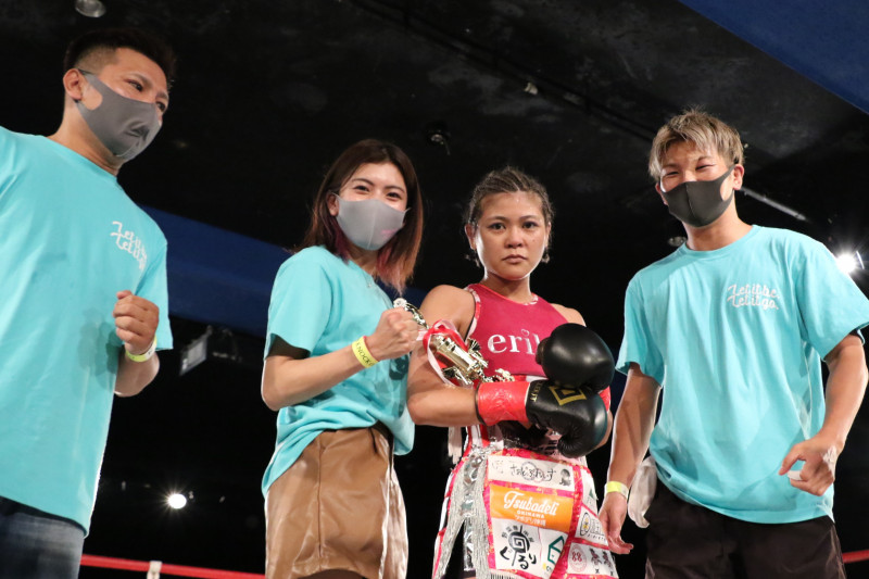 erikaが祥子をパワーで押し切りフルマークの判定勝利、セコンドのぱんちゃん璃奈と喜びを分かち合う
