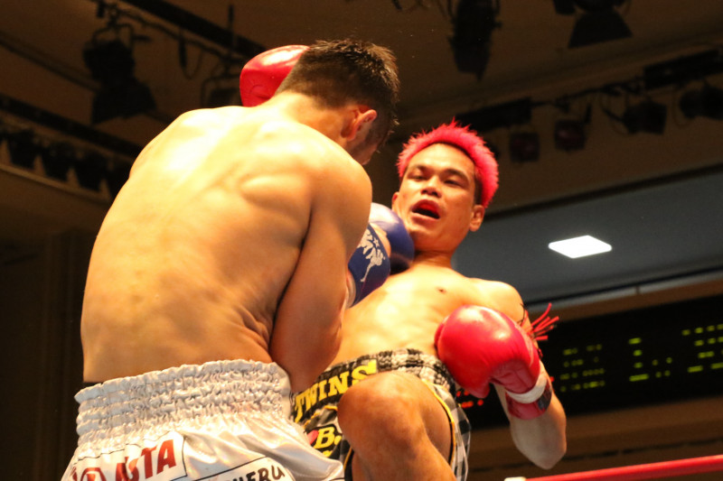 スタミナが落ちないセーンアティットが鈴木に組み付きヒザを突き刺す