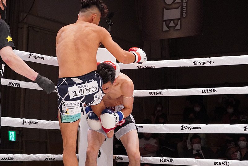 ヒザ蹴りを見舞う北井