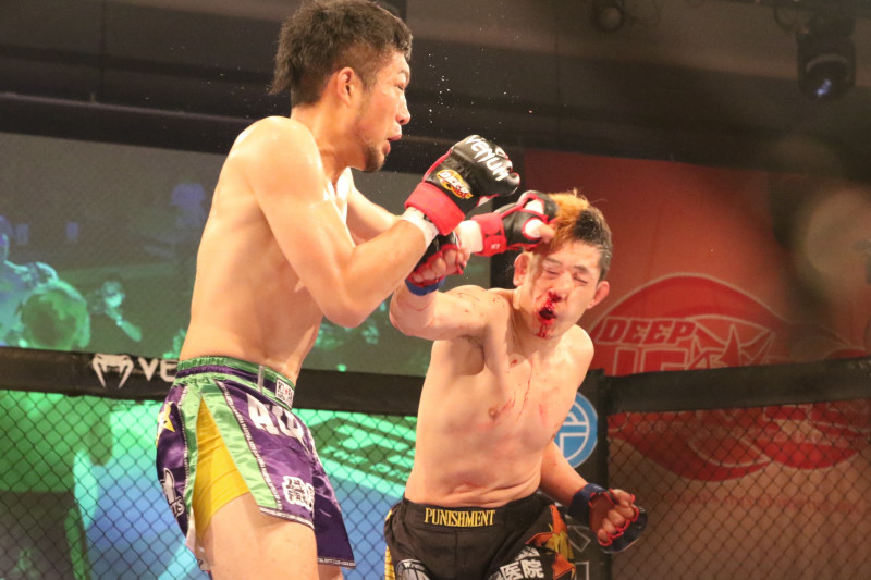 壮絶な打撃戦で小川は鼻血を流し、ユーキは左頭部を腫らす