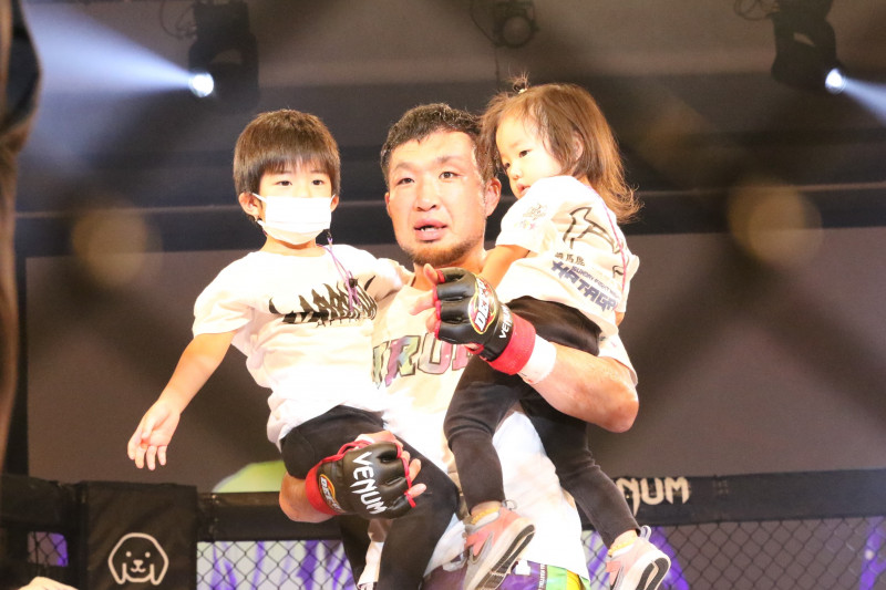 勝利のケージに子どもたちを上げるユーキ「樹理につなげた」と7月に暫定王座戦へ挑む弟の大原樹理へバトンを渡す
