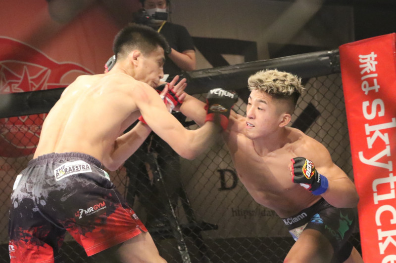 平田は大きな右フックで応戦するも致命打には至らず
