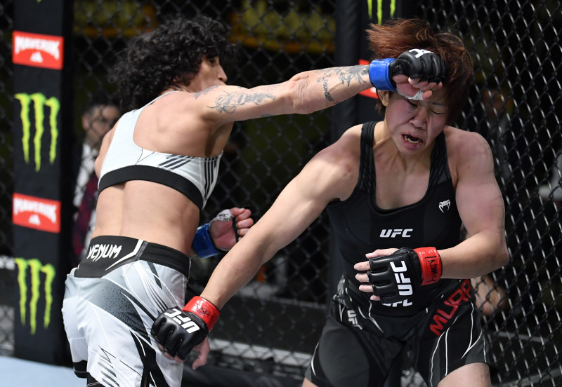 強烈なパンチを被弾する村田(©Getty Images/UFC)