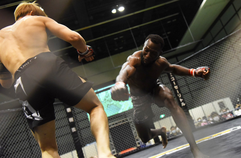 フルスイングの打撃で笹川(左)を追い込むダリ(右)